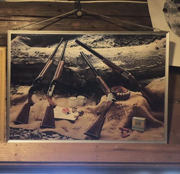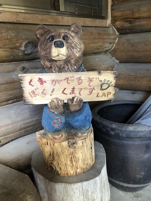 店のドアを開けるとすぐに、「熊出没危険」の看板と「猟銃の写真」が目に入ります