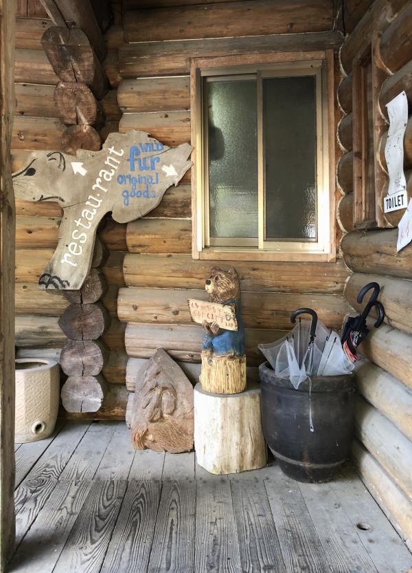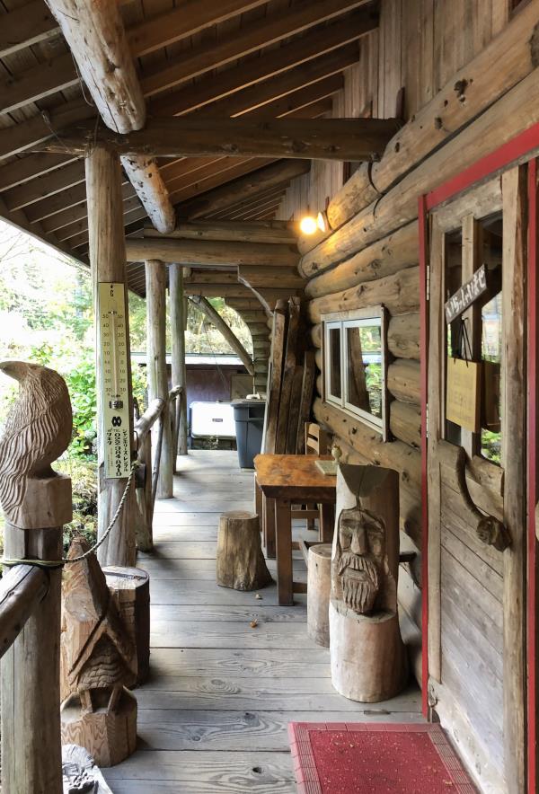 店の看板、手すり、木彫りの置物、手作り感満載です
