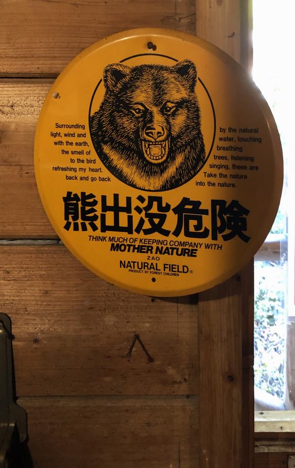 熊の子供が熊注意の看板をもっていますね